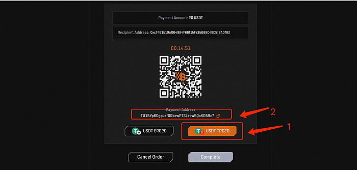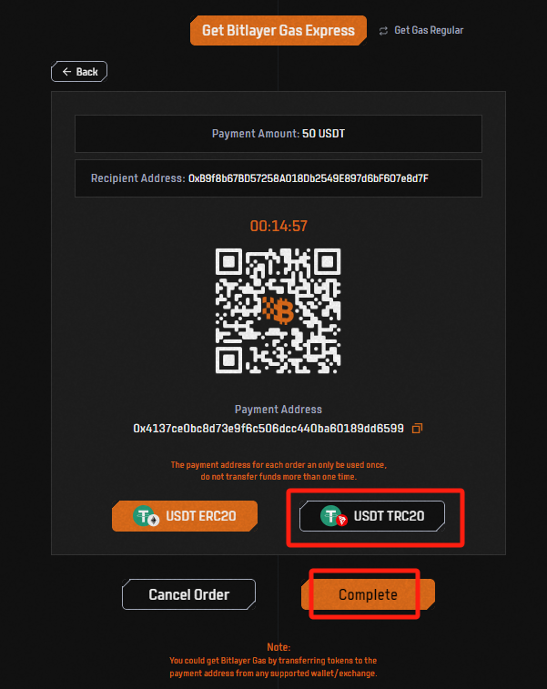 - Users should send the corresponding amount of USDT to the payment address. Note that you can make the transfer from any wallet or exchange that supports TRC or ERC standards. After completing the transfer, click “Complete.” Expect approximately a 1 minute wait before you’ll receive Gas in your receiving address.